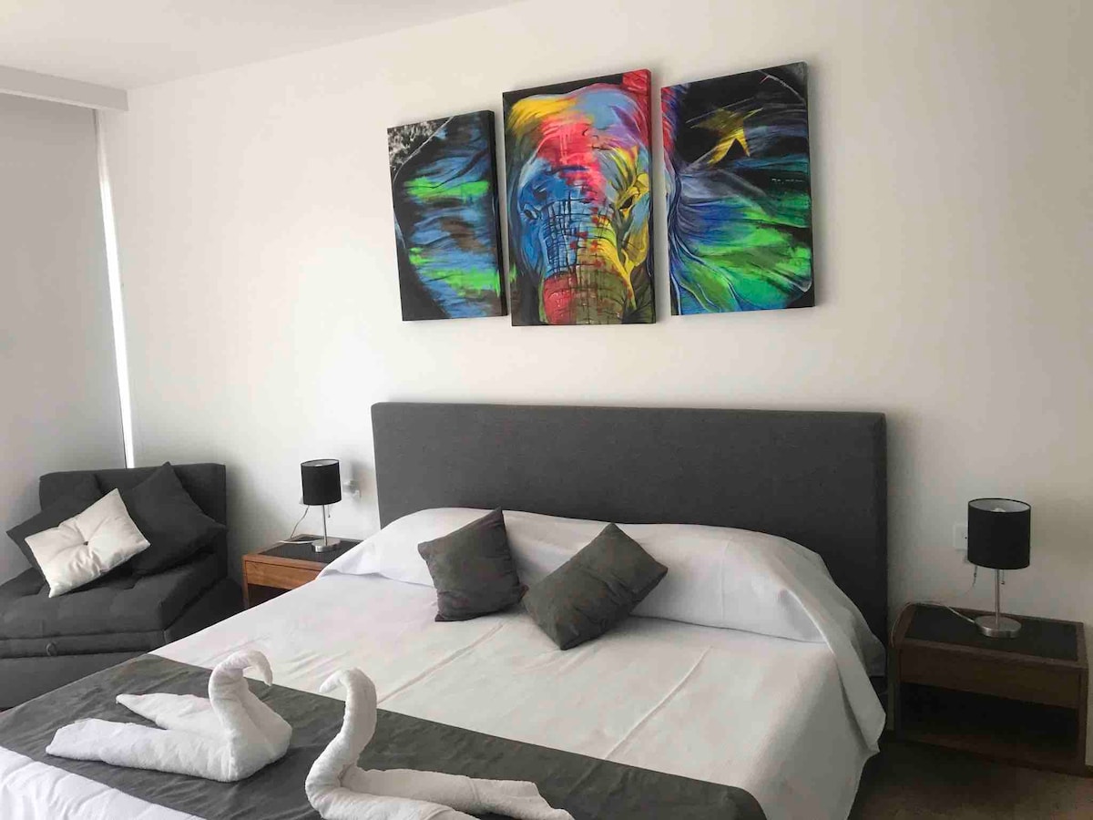 Disfruta del fácil acceso a todo desde este alojamiento perfectamente ubicado. A unos pasos de la 5ta avenida y a 5 minutos caminando a la playa Edificio con vigilancia 24 hrs, espacio de estacionamiento hasta 5 autos, previo aviso Cercano a bares y restaurantes, múltiples servicios para reservar tours NOTAS IMPORTANTES: -El colchón es king size con comfort medio, no realizamos reembolsos por comfort del colchón. -El baño cuenta con dispensador de jabón y shampoo