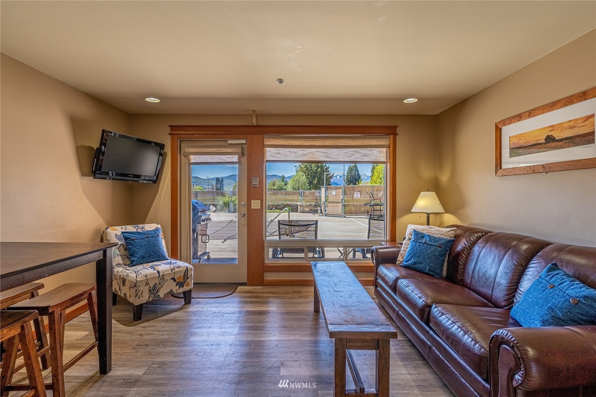 Este acogedor condominio de estilo Lodge en la planta baja tiene todo lo que quieres para una escapada. Mantente fresco con aire acondicionado en todas partes. Relájate con una película o juegos al final de la noche en la cómoda sala de estar. El Alpine Adventure Park está literalmente al otro lado de la calle. Puedes ir caminando a Waterfront Park en 10 minutos o caminar al centro de la ciudad en 15 minutos. Estás cerca de todas las tiendas y restaurantes y degustación de vinos, pero lo suficientemente lejos como para obtener la paz y la serenidad que deseas.