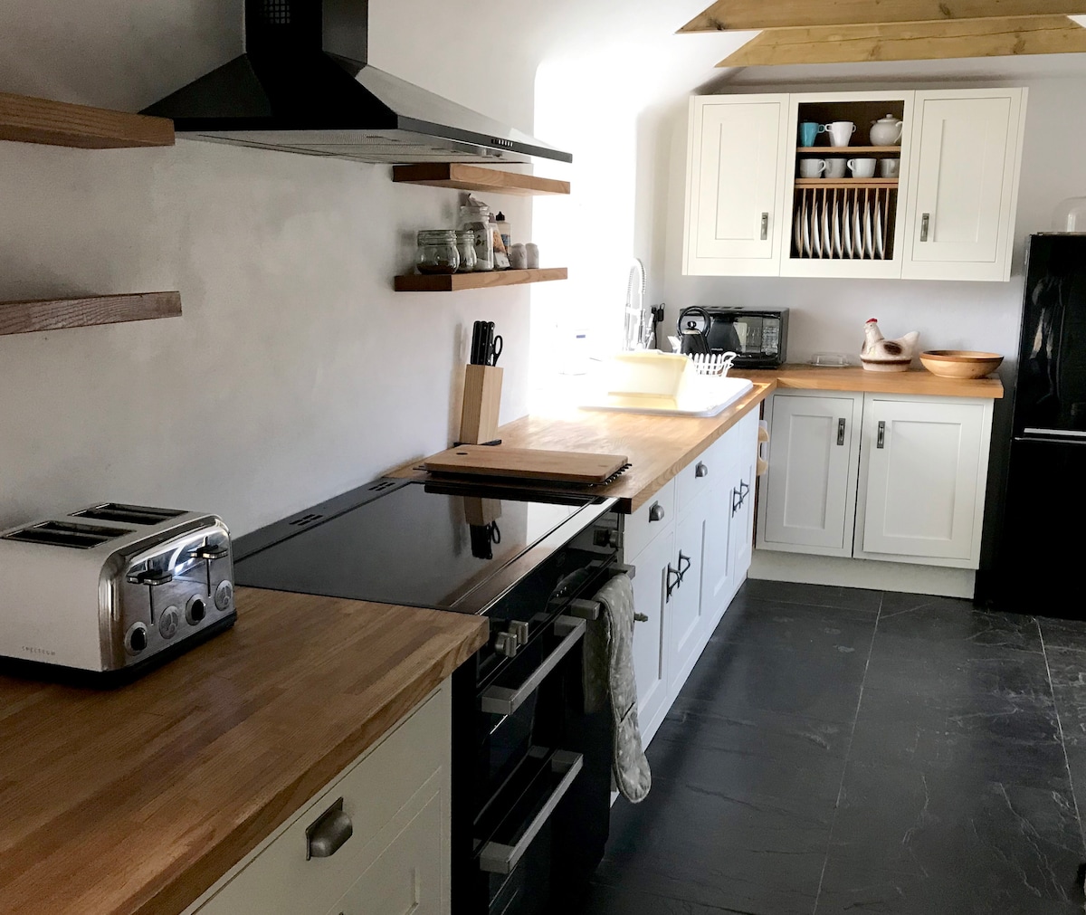 Un espacio tranquilo y profundamente lujoso para recargar energías y reconectar. The Shippon es un establo de vacas meticulosamente convertido con suelos de hormigón pulido y radiante, paredes de color verde oscuro suavemente curvadas, cocina hecha a mano, rincones de lectura cálidamente iluminados y materiales naturales. Mantas de lana, sofá de plumas, estufa de leña escandinava antigua, cama tamaño king con sábanas y edredón franceses, ducha de cascada y las toallas más suaves. Nuestra tranquila aldea de Devon solo está iluminada por las estrellas por la noche. Es posible que duermas mejor de lo que has dormido en años.