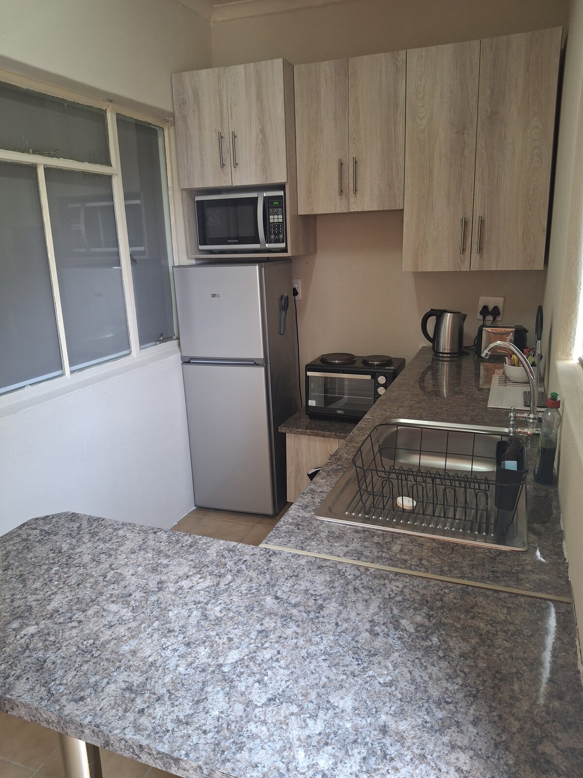 This modern self catering unit is situated in a quiet area yet close to town. It has a queen size bed, spacious walk in shower and a kitchen with a full size fridge. You also have a verandah where you can either relax or sit and work.
