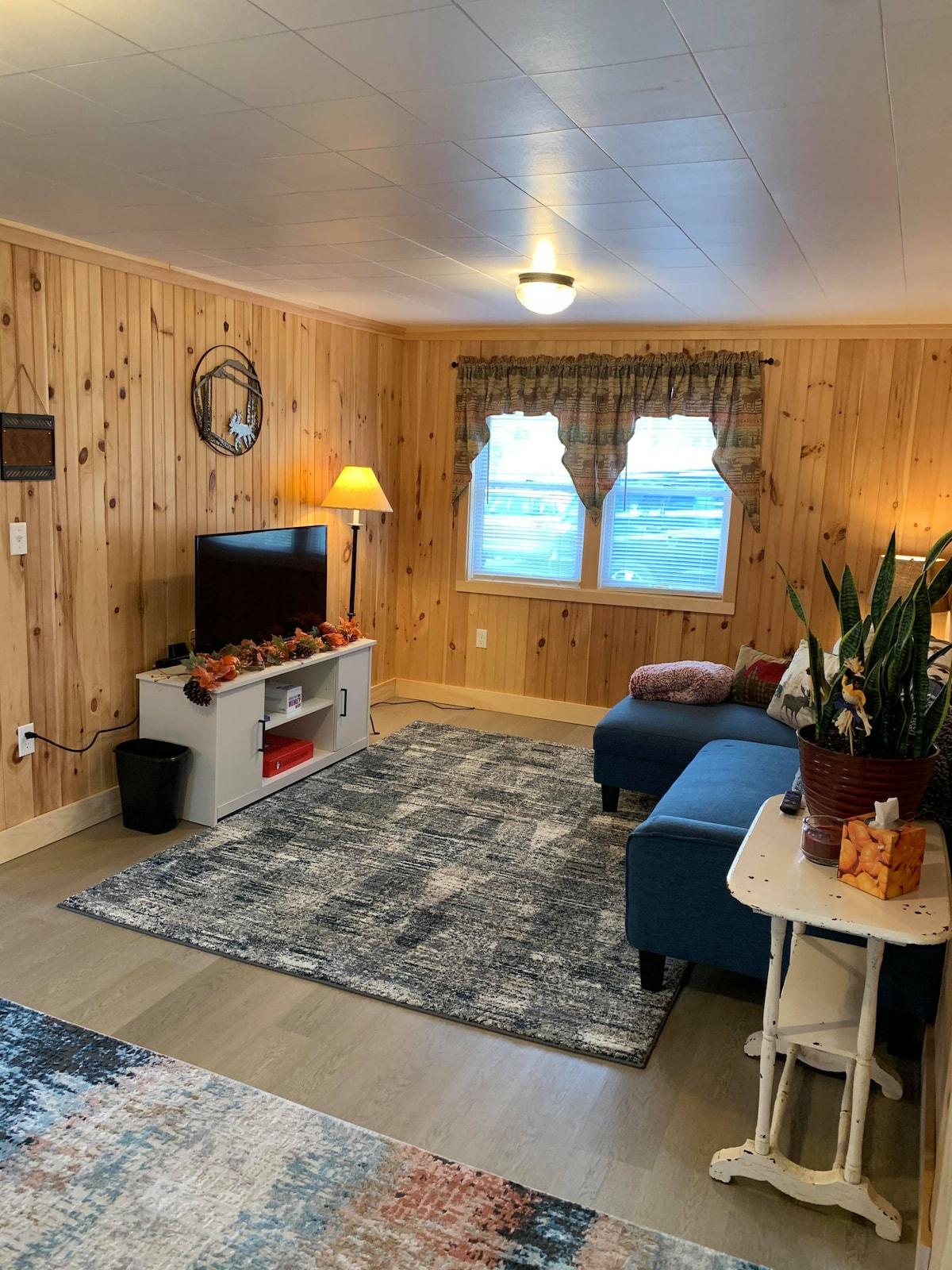La planta principal tiene sala de estar, cocina y comedor, 1 cama tamaño queen, con un sofá cama y una cama nido. El loft tiene 2 camas individuales. El sofá se puede utilizar como cama, baño completo. No tiene fregadero en la cocina, pero tiene una zona de cocina con microondas, horno grande de aire, nevera/congelador, tostadora y cafetera, plancha/tabla. También cuenta con TV, reproductor de DVD/Blue Ray, barbacoa de gas (de mayo al 1 de noviembre), así como una mesa de pícnic y un pozo de fuego al aire libre. Para los huéspedes que viajan en avión, se proporcionan toallas, previa solicitud.