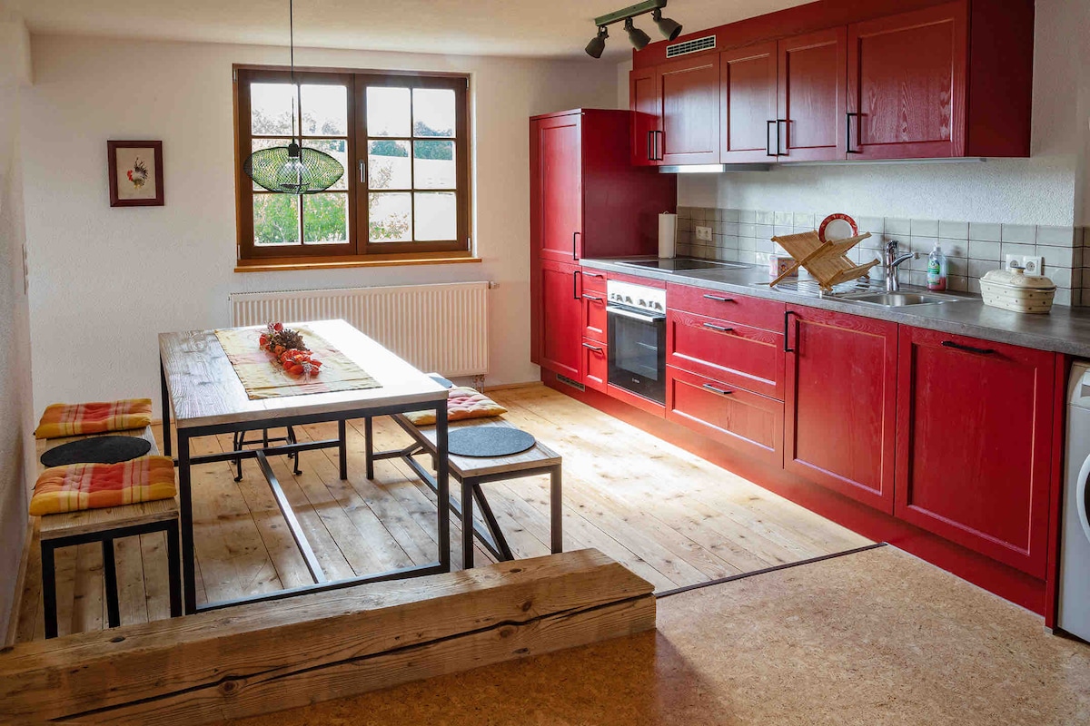 El apartamento está en la planta baja de una antigua granja, recién reformado y modernamente equipado. Excelente ubicación, entre la Selva Negra, el lago Constanza y Alb. Ideal para 2 personas. Salón-dormitorio con zona de estar y cama doble, persianas opacas. Cocina totalmente equipada: cafetera Senseo... Baño con luz natural y ducha de efecto lluvia. El apartamento es independiente, vivimos arriba y usamos la misma entrada. El apartamento no tiene mascotas, pero nuestro gato vive en la casa y el jardín.