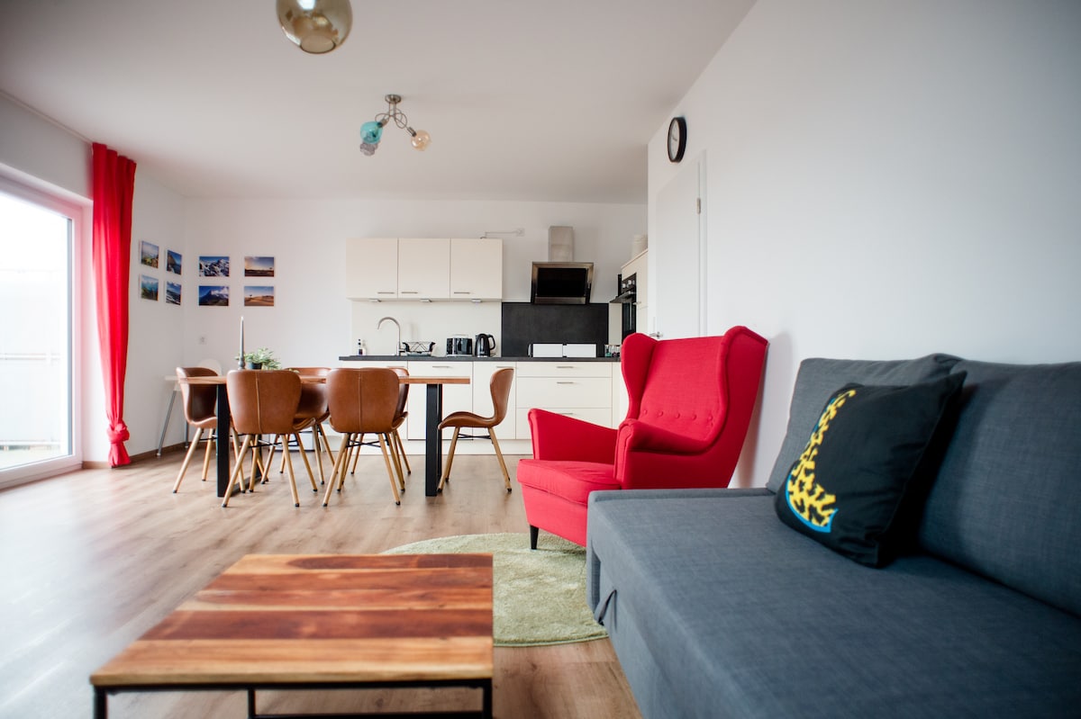 Ofrezco un apartamento bonito, acogedor y tranquilo para alquilar. Está equipado con persianas enrollables, alfombras y calefacción por suelo radiante. 2 camas individuales y un sofá cama muy cómodo para 2 personas sirven como lugar para dormir. Una mesa y 4 sillas forman el centro para una ronda acogedora. En la minicocina hay un fregadero, 2 hornillas, nevera, tostadora, microondas, campana extractora y mucho más. En el baño hay ducha, inodoro y lavadora-secadora.