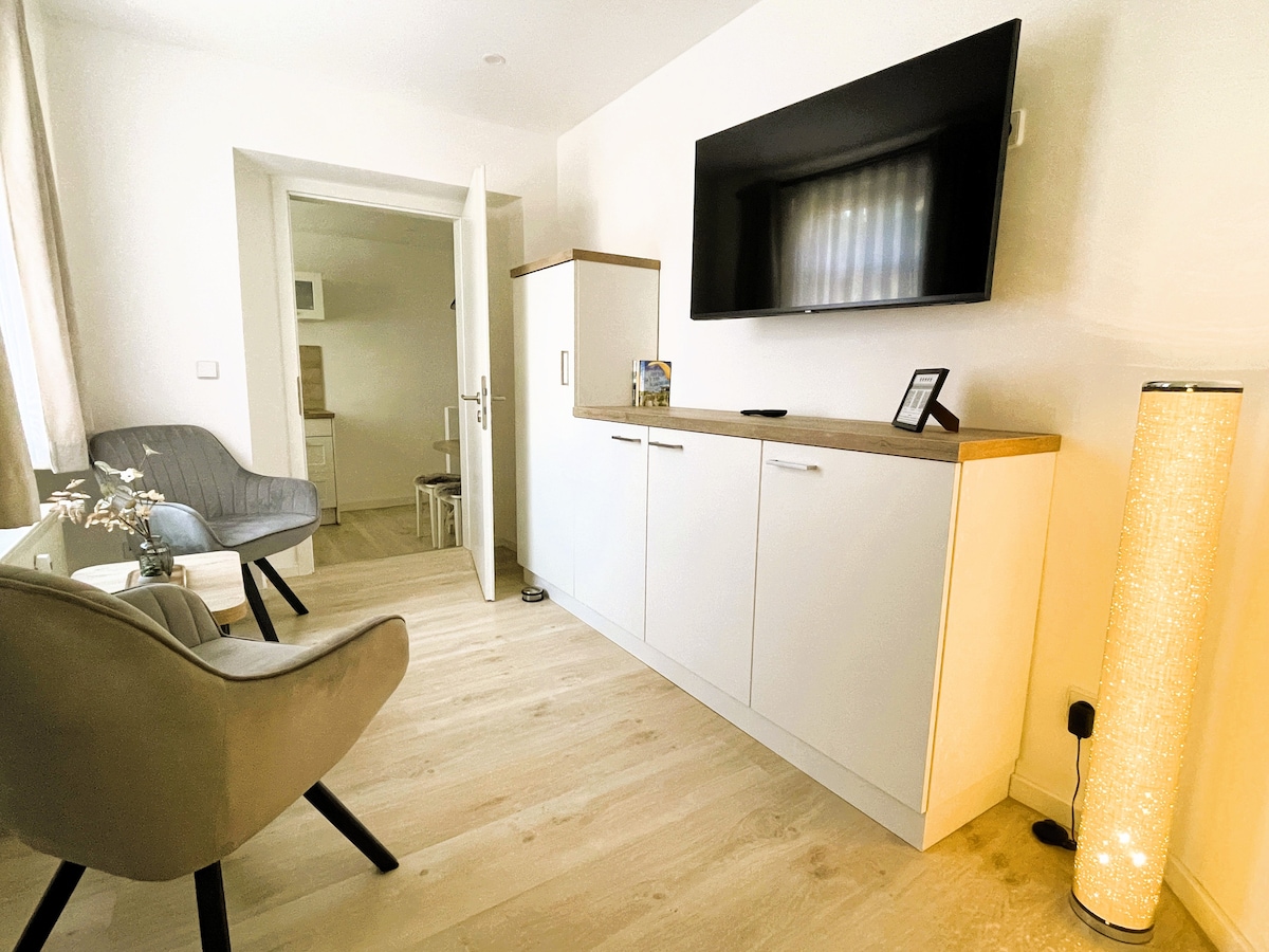 El apartamento está en la planta baja y es muy fresco en verano. Fue completamente renovado y diseñado por nosotros mismos con mucha habilidad artesanal y cariño. El taller de carpintería está en la casa. (solo como hobby... no se puede esperar ruido)😉 El jardín es un pequeño oasis y en él se encuentra mi taller de floristería, que dirijo comercialmente. Las habitaciones del apartamento son luminosas, espaciosas y agradables. Hay persianas opacas instaladas. La cocina está bien equipada con todo lo necesario. Como anfitrión, vivo en el lugar y estoy disponible en cualquier momento para responder a cualquier pregunta. Hay libros y juegos disponibles.