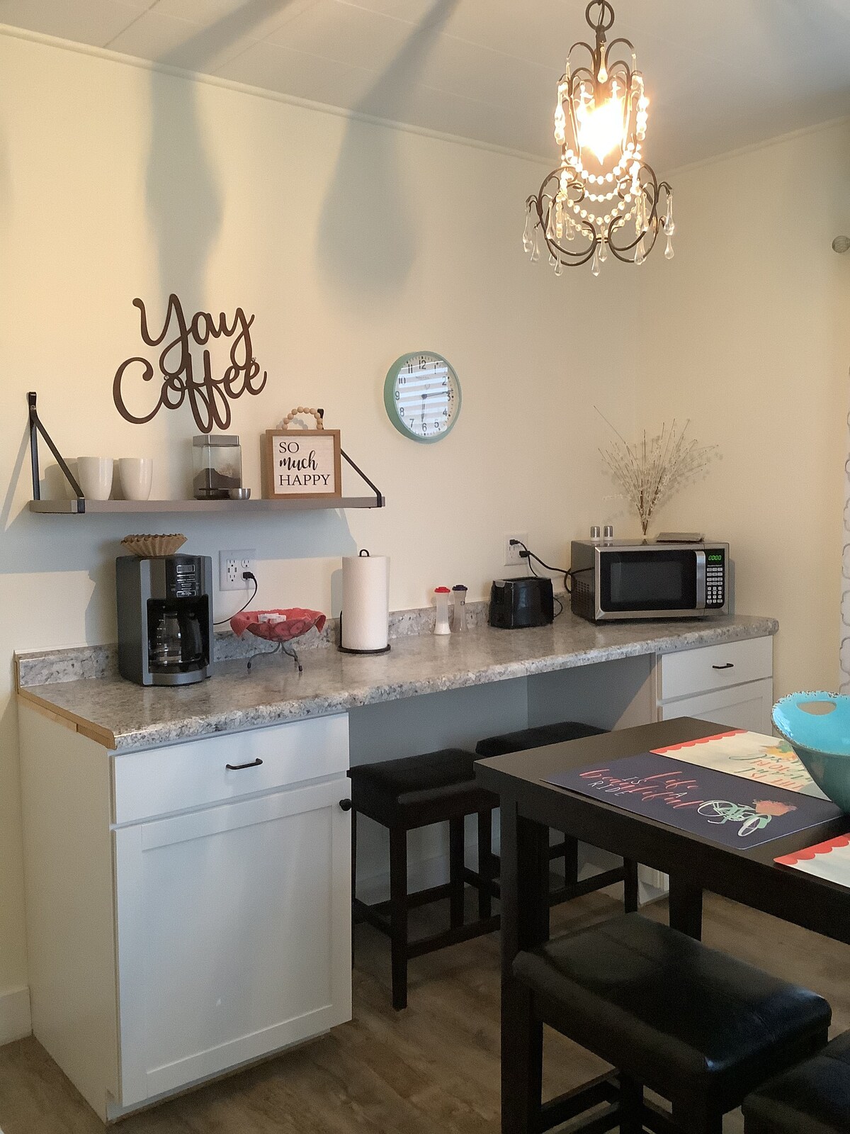 Suite privada de 2 dormitorios en la PLANTA SUPERIOR. Cocina pequeña con refrigerador, cafetera, microondas, tostadora, sartén eléctrica. Sin fogones. Baño privado. Cama queen en un dormitorio. Dos camas individuales en el segundo dormitorio. Aparcamiento disponible en el hotel. Cerca de playas, golf, cervecerías y ruta del vino. Casa más antigua, pero las unidades se han actualizado. La suite Chandelier es una de las tres suites de esta ubicación. Suite Lake Breeze Suite Beachcomber No se permiten mascotas.