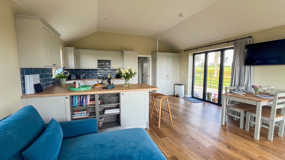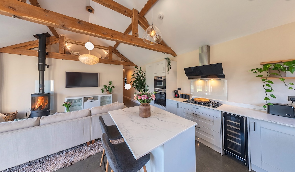 Hardwick Lodge Barn es un granero bellamente convertido que combina el estilo contemporáneo con el encanto rústico. Ubicado en una zona rural, ofrece un refugio tranquilo rodeado de una pintoresca campiña. Los suelos de hormigón pulido y las puertas plegables proporcionan luz natural y apertura, mientras que las vigas de roble originales añaden carácter. Relájate junto a la estufa de leña o explora la belleza de Northamptonshire. Diseñado para la comodidad y el estilo, el Hardwick Lodge Barn es ideal para una escapada rural con comodidades modernas.