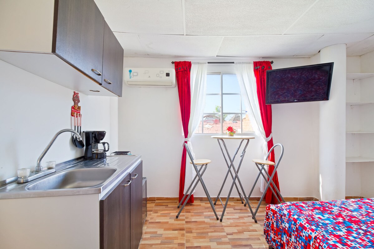 La habitación cuenta con baño privado, aire, cama doble y closet y una pequeña cocina, tv cable y internet.