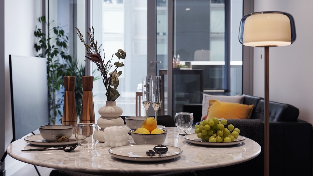 Un espacio tranquilo para llamar hogar mientras estás en Melbourne, tu propio apartamento de 2 dormitorios y 2 baños (64 metros cuadrados internos + balcón de 6 metros cuadrados). Diseñado pensando en un santuario simple, moderno y minimalista. Disfruta de las increíbles vistas del perfil urbano. Este es un espacio de ambiente familiar. Ubicado junto a la estación de Southern Cross y la terminal de autobuses Sky Bus. Situado en la zona de tranvía gratuito, todo lo que Melbourne tiene para ofrecer está a tu alcance, cerca de comida barata, restaurantes elegantes y cafeterías de moda.