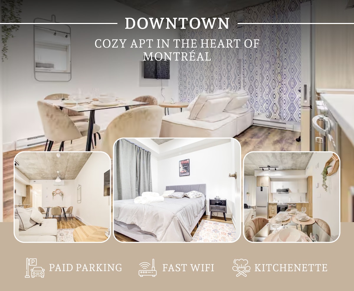 ¡Apartamento situado en pleno centro de la ciudad con acceso directo al Bell Center! Disfruta de tu estancia con lujo y comodidad en un apartamento de un dormitorio totalmente amueblado que incluye café, tostadora, hervidor de agua y todos los utensilios de cocina gratuitos. ¡Sauna, piscina, gimnasio con numerosas pesas y máquinas, salón panorámico, sala de juegos, salón y terraza con múltiples barbacoas a tu disposición! ¡Disfruta de un aparcamiento subterráneo gratuito y de un acceso a 1 minuto al sistema de metro sin tener que poner un pie fuera! Netflix incluido.