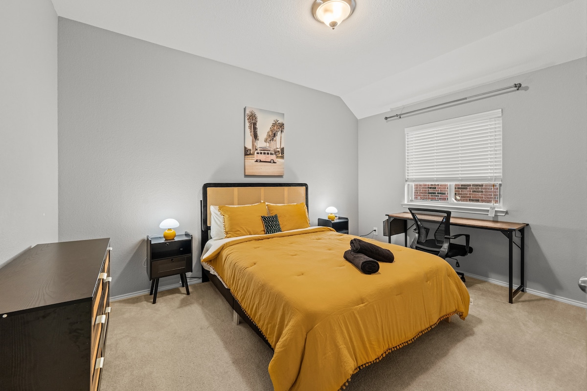 Entrada privada a la puerta principal, “baño no compartido” cómodo de 1 dormitorio, 1 baño en la parte delantera de la casa, la segunda habitación estará 🔒 durante tu estadía. Este espacio está bajo el mismo techo, separado del lado del anfitrión por puertas francesas cerradas con llave cubiertas con cortinas que brindan a los huéspedes total privacidad. El anfitrión utilizará la entrada del callejón trasero / garaje durante tu estancia. • Un dormitorio: con cama doble. • Cocina/fregadero • 1 baño. • Llegada autónoma • Aparcamiento en la calle justo enfrente de la casa • Mini split.