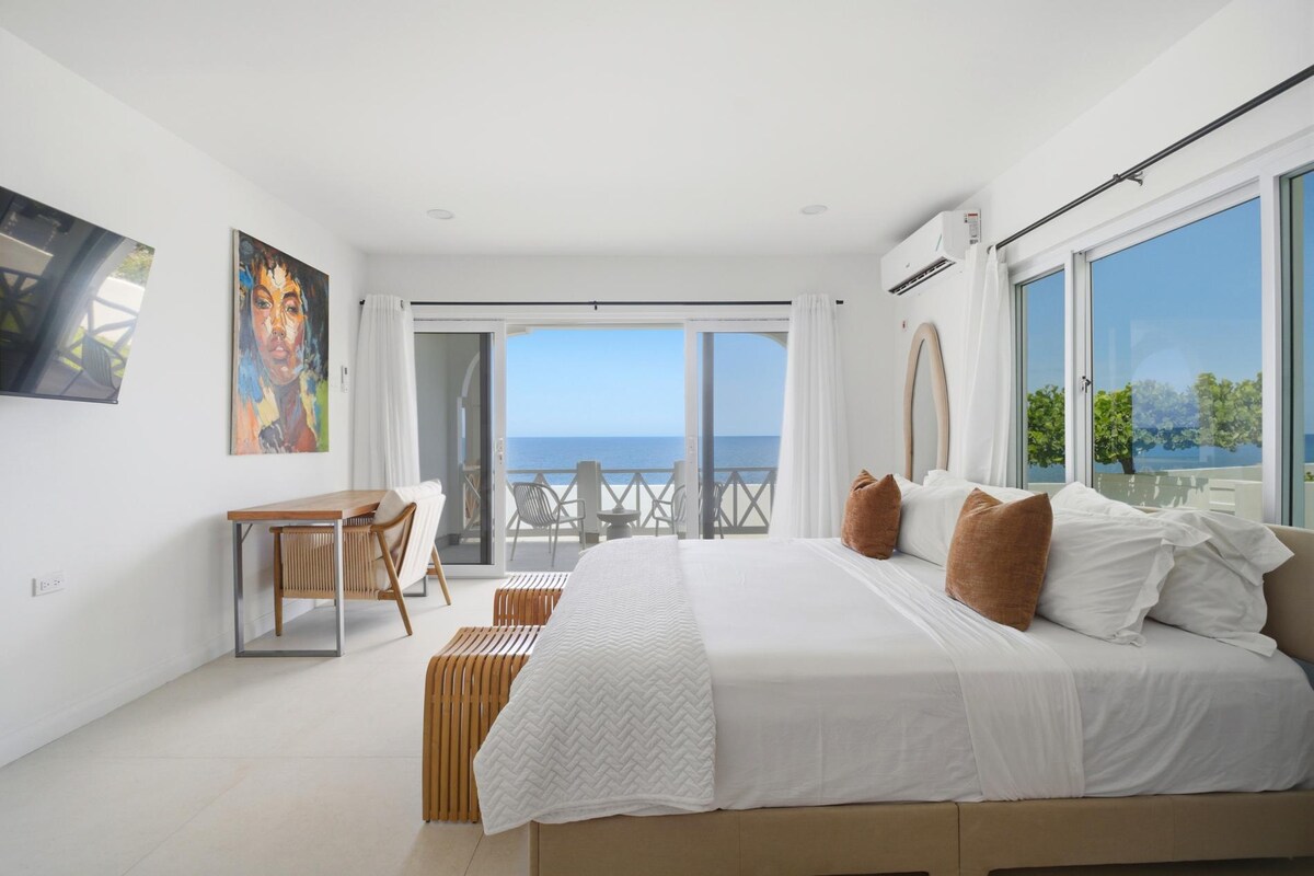 Suite con cama king y vistas panorámicas al mar desde la azotea