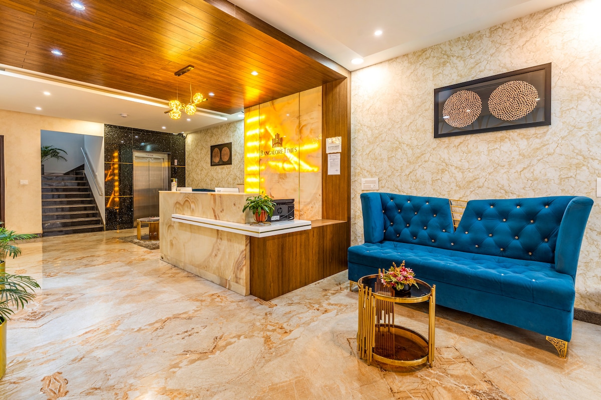 ◆ Tucked into a tranquil corner of AECS Layout, the Executive Suite offers a bright 200 sq ft king-bedroom with cosy lounge seating, soft lighting, and welcoming simplicity. ◆ With easy access to Brigade Tech Park, Cessna Business Park, AECS Layout bus stop, Kundalahalli metro station and KR Puram Railway Station (~ 6 km), you’re just minutes from work, travel links, and local favourites. ◆ Enjoy meals at the airy 6th-floor restaurant or unwind in the inviting ground-floor reception lounge.