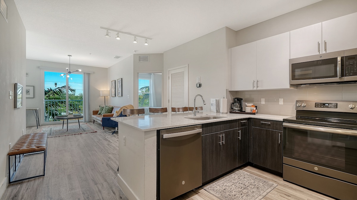 Este apartamento de nueva construcción cuenta con una isla de cocina de gran tamaño y un deslizador con vistas al centro de Sarasota. Los servicios compartidos incluyen: un gimnasio; terraza para ver el atardecer; enorme terraza en la azotea con piscina; cenador con TV de pantalla grande, chimenea y bar; un parque para perros; y acceso al espacio de oficinas Cowork adyacente. También en el lugar se encuentra Motoneko Cafe, una cafetería de servicio completo que también sirve té, bebidas de café expreso y aperitivos.