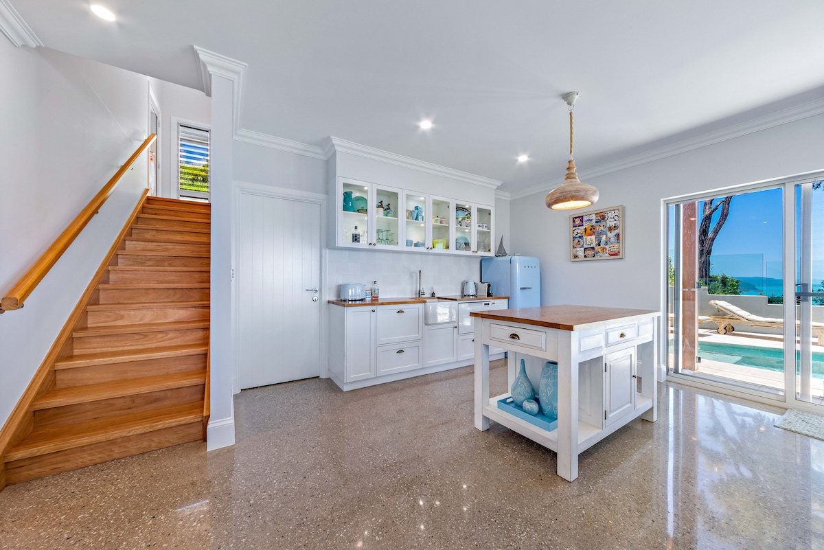 Nueva suite con vistas al mar, a la selva tropical montañosa y a la isla, que proporciona una sensación de paz y belleza. Cerca de la acción de los restaurantes y tiendas de Airlie, pero lo suficientemente apartada como para ser una experiencia muy relajante. Entrada propia, balcón, jardín, baño y cocina americana. A 4 minutos en coche o a 15 minutos a pie cuesta abajo de la calle principal y del transporte público. Pájaros, brisas, valles arbolados, jardines de rocas y vida silvestre. Suite situada en el extremo norte de la casa, se pueden escuchar algunos sonidos diarios. Respetamos tu privacidad.