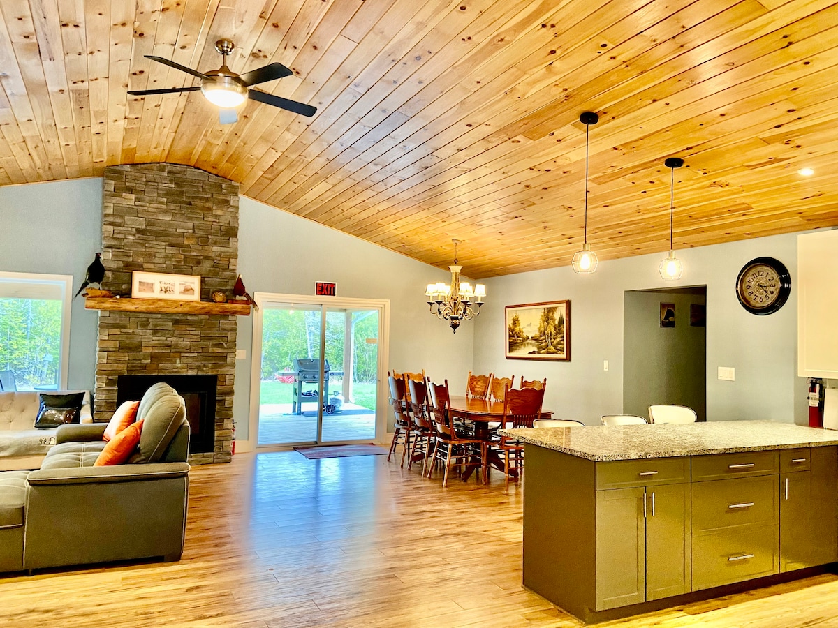 ¡Escápate a una casa de campo luminosa y espaciosa con impresionantes puestas de sol y vistas panorámicas de la bahía de Colpoy a las afueras de Wiarton! Perfecto para escapadas en grupo durante todo el año con: 4 dormitorios tamaño king, una cama tamaño queen Murphy y 3 baños completos, incluido un baño principal tipo spa. Disfruta de un diseño de concepto abierto con una cocina totalmente equipada, dos amplias habitaciones familiares con televisores inteligentes, dos amplios patios y una amplia zona de fogatas. Experimenta la belleza natural de la península de Bruce mientras te relajas con comodidad y estilo.