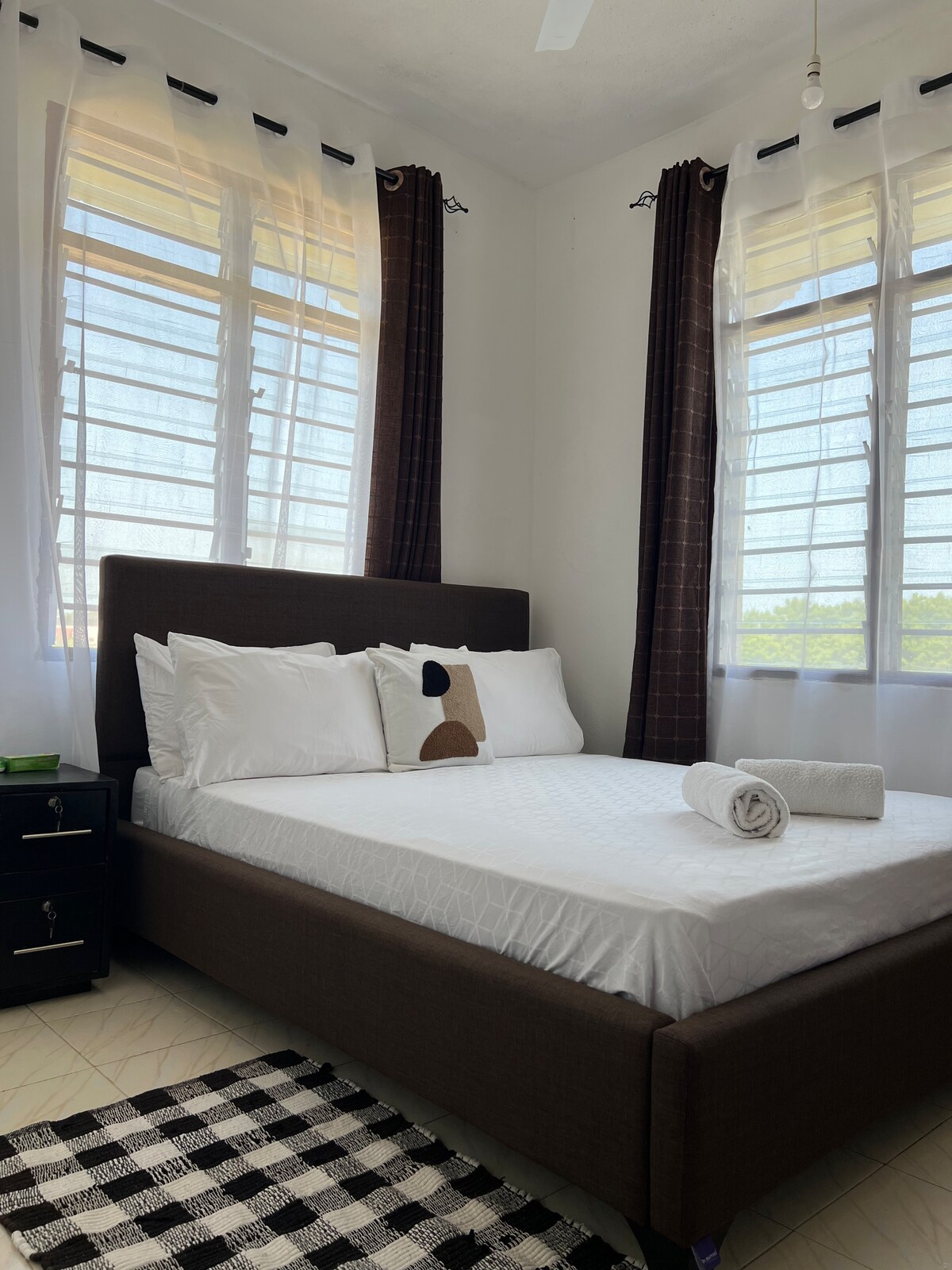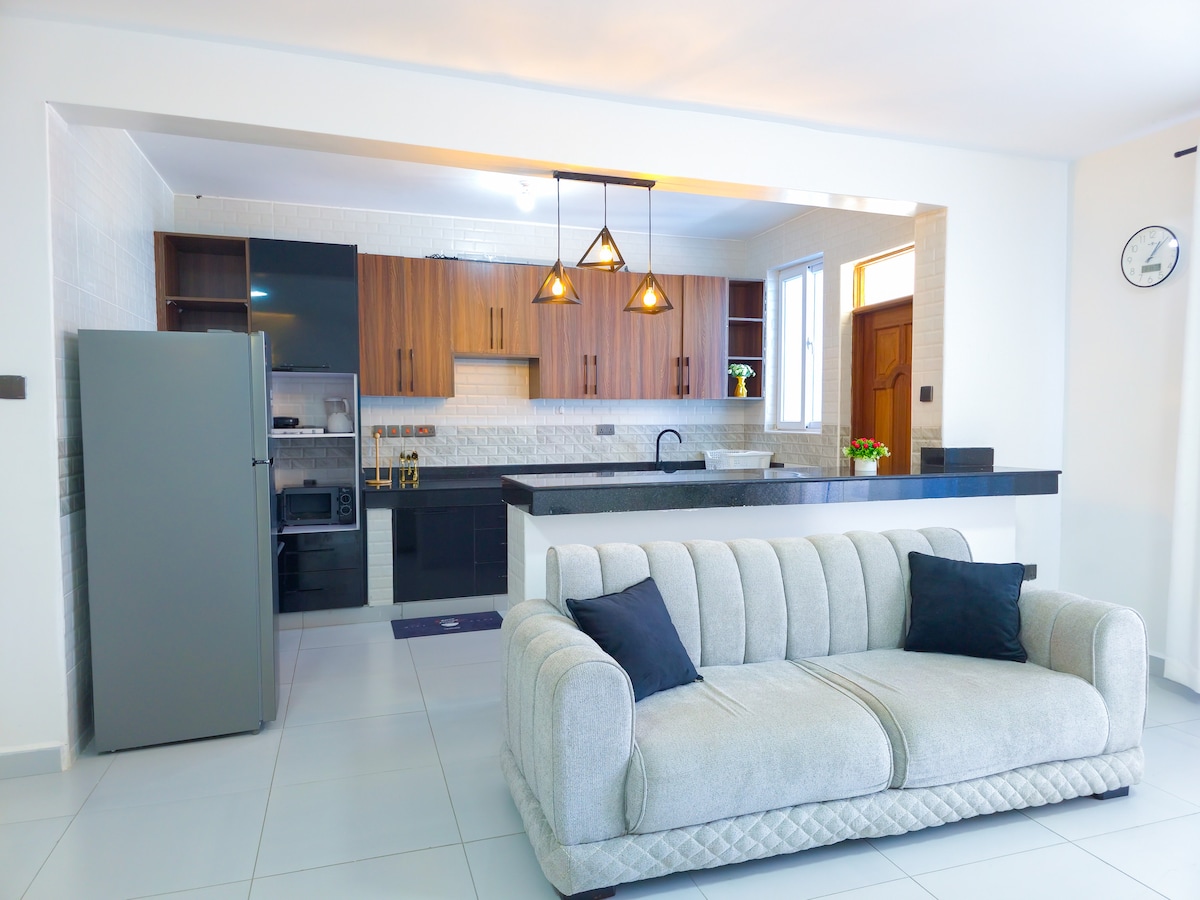 ¡Jambo huésped! Disfruta de la comodidad y la conveniencia en este departamento de 1 dormitorio en la costa de Nyali, a pocos minutos de playas, centros comerciales y restaurantes de primera. Ideal para viajeros solitarios, huéspedes de negocios y parejas. Qué tendrás: Amplio dormitorio con aire acondicionado, una cómoda cama tamaño king y mucho espacio de almacenamiento Luminosa sala de estar con una decoración de buen gusto y una TV Android. Cocina totalmente equipada con elementos básicos para cocinar comidas caseras. Wifi estable para trabajar Seguridad 24/7 y estacionamiento gratuito