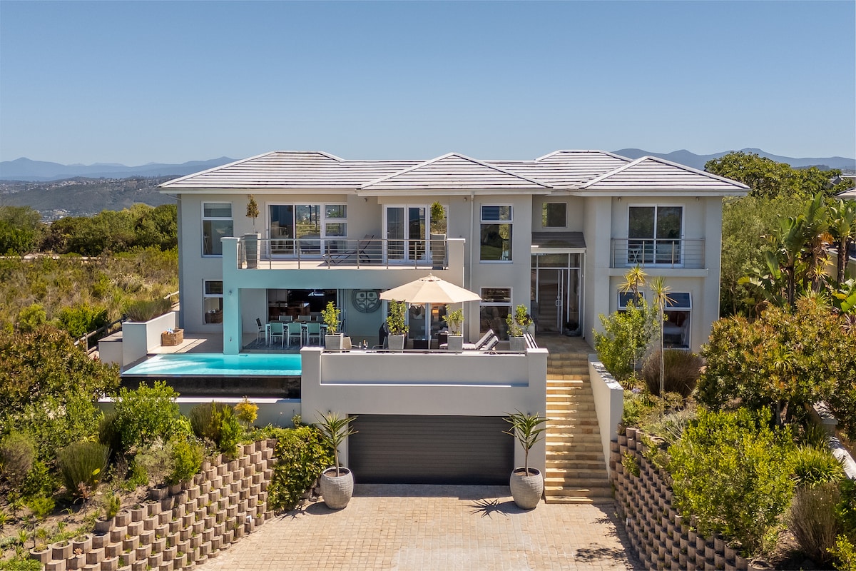 Con vistas al océano y a la laguna, enclavada en una reserva ornitológica contra una colina boscosa y a 5 minutos en coche de playas vírgenes y del centro de Wilderness, esta elegante casa independiente ofrece amplias salas de estar y comedores, una terraza con piscina climatizada, 3 dormitorios con baño privado y terrazas privadas con vistas al mar y al bosque. Las comodidades incluyen un gimnasio en casa, equipo de Pilates, Weber braai, TV inteligente de 75 pulgadas, DSTV completo, Play Station 4, mesa de fútbol y wifi sin límites.