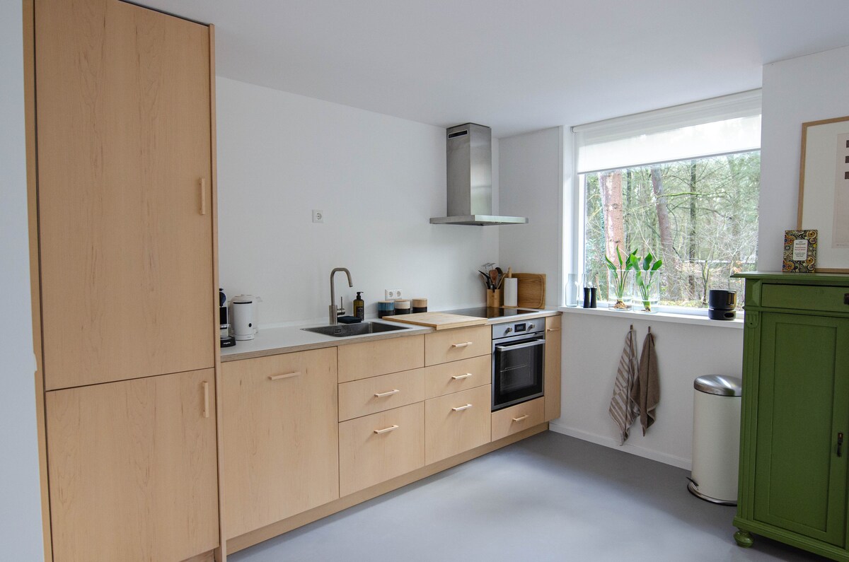 Bienestar de lujo al borde del bosque en el Veluwe. Casa de huéspedes única para dos personas con uso privado exclusivo de la piscina cubierta, duchas, baño privado y sauna (finlandesa). Entrada privada y cocina totalmente equipada en un jardín con aspecto de parque. ¡No se admiten animales! El edificio está hecho en gran parte de cristal (parcialmente espejado) y no tiene cortinas. A poca distancia en bicicleta de Hoge Veluwe, la estación de Apeldoorn y el Palacio Het Loo. Ubicación ideal para ciclismo de montaña, correr y paseos en bicicleta.