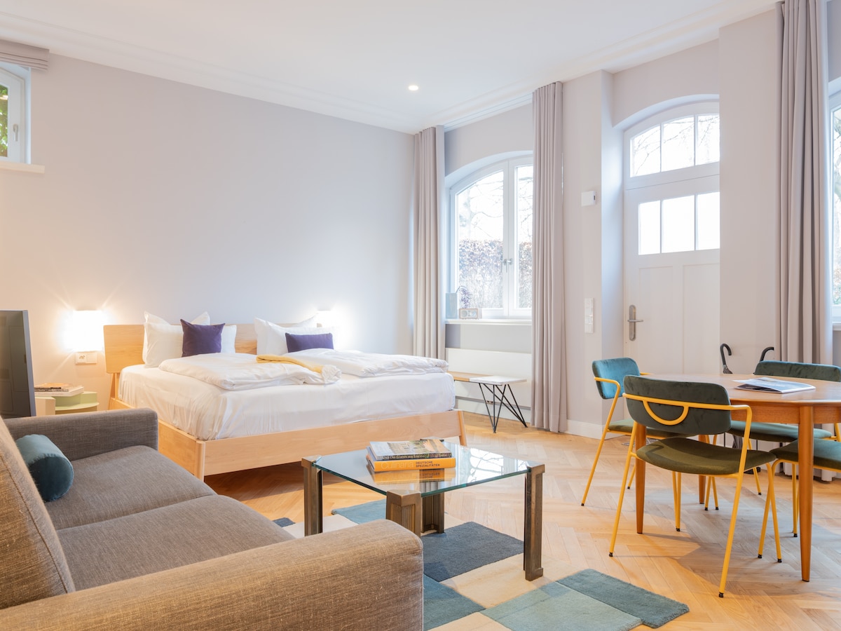 The apartment in the separate garden house is 44 square meters in size and features large sliding glass doors that lead onto the sun terrace. It can accommodate 2 people. The custom-made kitchen with dining area is luxuriously equipped and opens onto the living area with a cozy couch corner. The bedroom with a large double bed (180x200 cm) is separated by a modern room divider. It has an en suite bathroom with natural light.