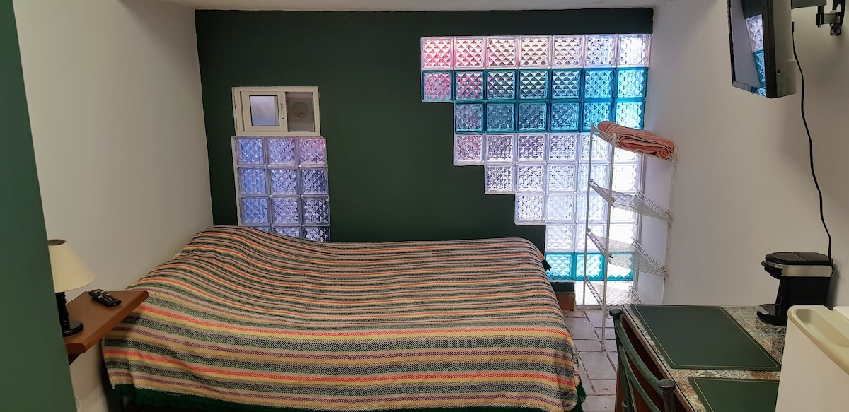 Disfruta de una experiencia con estilo y buen gusto en este alojamiento. Diseñado especialmente para disfrutar y relajarse. Es un espacio ideal para parejas o viaje de trabajo. Cuenta con un balcón con excelente vista panorámica, con suerte te puede tocar apreciar excelentes atardeceres. Contamos con persianas black out para regular la entrada de luz. Un amplio baño y vestidor para consentirte con una ducha. Y te aseguramos siempre tener café y té para esos momentos de paz.