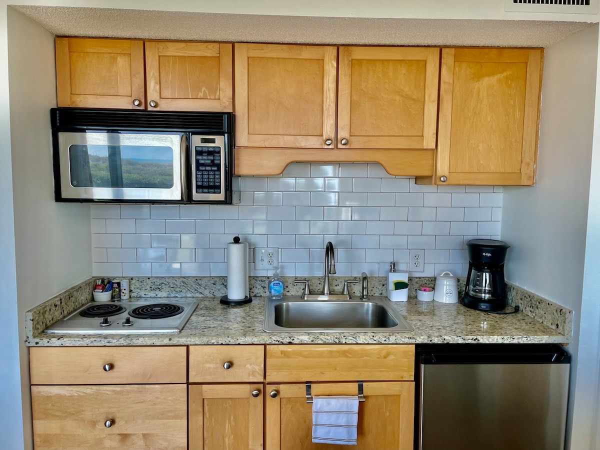 (Máximo de 2 huéspedes y sin MASCOTAS. Lo siento, pero sin excepciones). Apartamento tipo estudio bellamente decorado en el corazón de Wrightsville Beach. Una vez que estaciones en tu estacionamiento de primera fila, no tendrás que subir a tu auto hasta que te dirijas a casa. El condominio está a pocos pasos de la playa y a menos de un minuto a pie de tiendas, restaurantes, tienda de comestibles, cafetería, heladería, tiendas de surf, salón de belleza y tienda de suministros de playa de alquiler. Cocina totalmente surtida, todas las sábanas y toallas incluidas. Por favor, trae tus propias TOALLAS DE PLAYA.