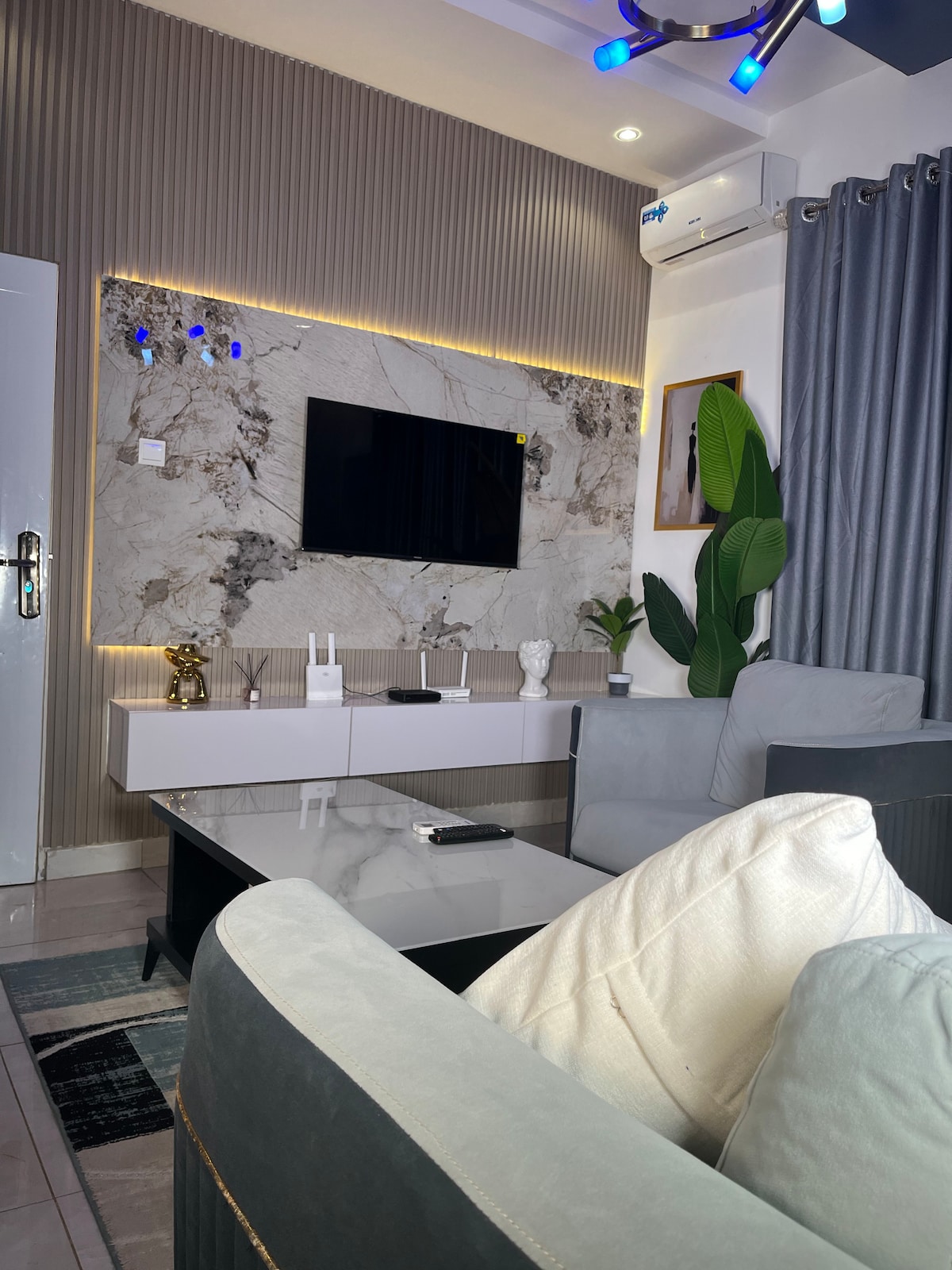 Dormitorio Aro de baloncesto Balcón privado Wifi de fibra óptica Lavadora Sala de estar amueblada Cocina Totalmente Equipada 2 aseos y 1 baño. PlayStation 5 (FIFA, Hit Man, MK) Proximidad a restaurantes y tiendas Ropa de cama y toallas limpias y frescas. 2 aires acondicionados con energía solar e inversor Excelente servicio de atención al cliente y soporte Puerta con código de acceso y cámara en la entrada Televisores inteligentes de 65 y 55 pulgadas (Prime, Netflix y DSTV) Barrio sereno, seguro y hermoso Electricidad 24/7 (solar, inversor y generador)