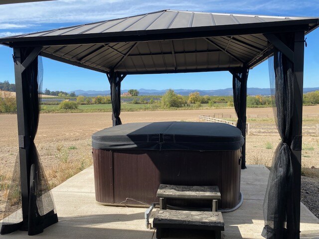 Relájate en tu casa de huéspedes privada con sauna interior y Marquis Spa (bañera de hidromasaje). Disfruta de la piscina y la bañera de hidromasaje al aire libre. ¡Juega al golf en las cajas de salida, juega al chip alrededor de 2 hoyos, explora nuestra propiedad de 10 acres, disfruta de la tranquila vista del huerto de avellanas, los campos de heno y las montañas mientras te relajas y te enamoras de la región vinícola de Oregón!