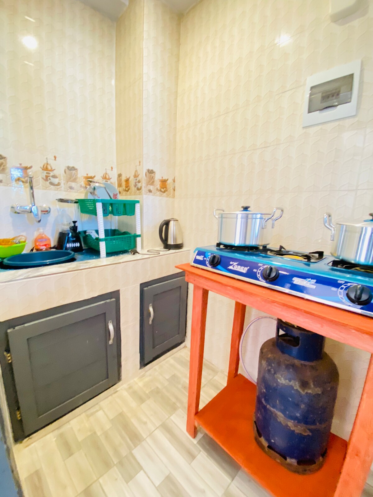 Résidence meublée une villa de deux chambres autonomes et une toilette pour les visiteurs, un grand salon confortable et une salle à manger, une cuisine équipée et un parking. La particularité de cette résistance c’est le calme et un endroit paisible et discret