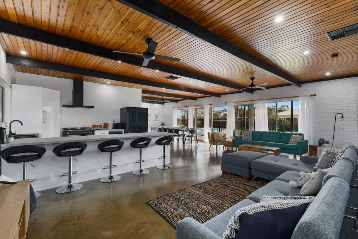 Retro 70s style meets lakeside living at Yarrawonga by Twin Palms—your Yarrawonga accommodation in Silverwoods Estate with outlook to the Black Bull Golf Course (5th). 4 queen bedrooms, 2 bathrooms, open-plan living and full kitchen. Stroll to Lake Mulwala and cafés. Unwind by the outdoor fire, BBQ, pool table and retro arcade. Ducted heating, evaporative cooling, fast Wi-Fi, self check-in and parking. Perfect for families, golfers and groups.