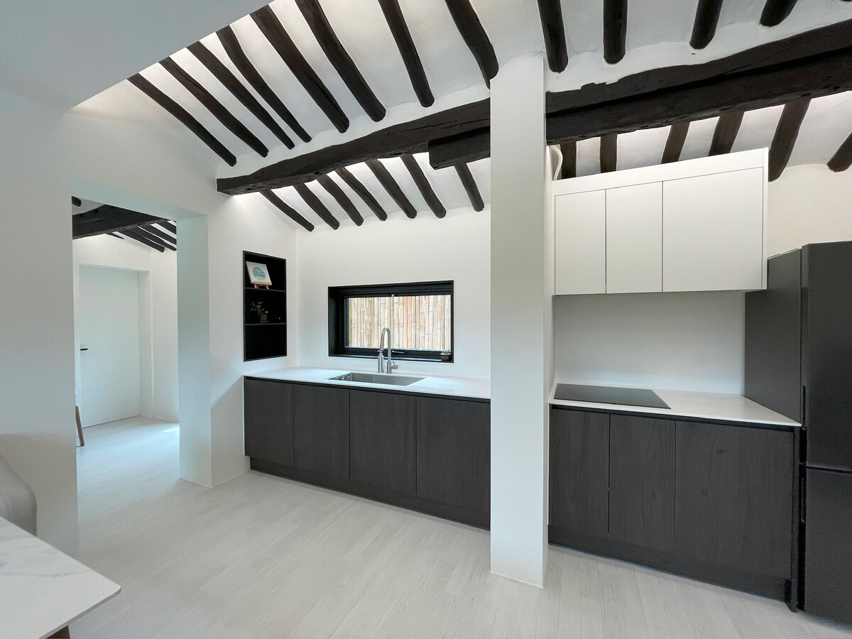 Located in the quiet countryside of an old village, this home is perfect for families. Preserving traditional wooden beams with a modern design, it offers a warm yet stylish atmosphere. Relax in the large bathtub, enjoy a barbecue in the yard, and park conveniently right in front of the house. Two beds are provided, with extra mattresses available for additional guests. Surrounded by nature, it’s an ideal place for a peaceful and relaxing stay.