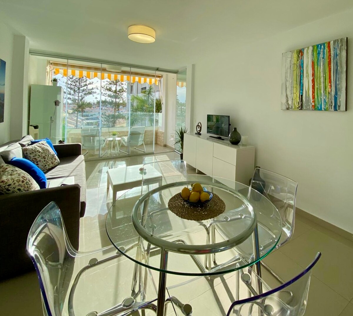 Moderno, totalmente reformado, decorado con estilo, amueblado a medida y equipado para hacer que disfrute una cómoda y agradable estancia. Aire acondicionado. Áreas comunes con jardines y 2 piscinas en un ambiente tranquilo. A un tiro de piedra del Yumbo Shopping Center con su inmensa oferta de ocio. A 5 minutos andando de la Playa del Inglés y las dunas de Maspalomas. El lugar perfecto para unas vacaciones memorables!