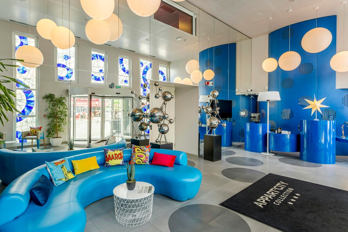 Our comfortable and practical 24m² air-conditioned double studios have two single beds, soundproof windows, blackout curtains, 4k at screen TV and in some cases a balcony. You will appreciate the functionality of the kitchenette equipped for 2 people. You can also take advantage of the ofce space with telephone and wi internet. For your comfort, the bathroom is equipped with a towel dryer.