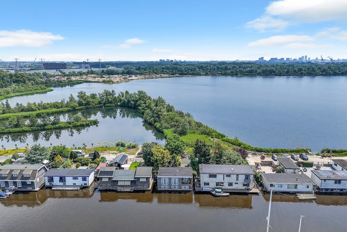 Relájate con toda la familia en este lugar tranquilo para hospedarte. En la hermosa naturaleza y rodeado de agua, pero aún a 15 minutos del centro de la ciudad. La casa flotante tiene todas las comodidades, como una estufa acogedora, buenas camas, proyector y sauna/gimnasio. Hay 2 habitaciones para niños. Tenemos dos gatos que puedes cuidar durante la estancia. Son muy cariñosos, juguetones y buenos con los niños.