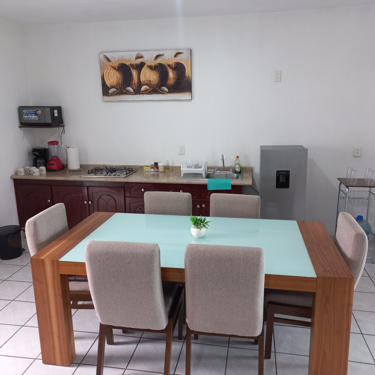 Casita de huespedes. Cuenta con baño privado, cocina, parrilla eléctrica, refrigerador, cama matrimonial, escritorio, closet, 1 cajón de estacionamiento, Wifi, televisión con cable y bocina. Ideal para una pareja que busque hospedarse en un lugar agradable y seguro mientras recorre la bella perla de occidente. También es ideal para estudiantes foráneos, ya que nos encontramos a 7 min de la universidad ITESO, UVM y TEC Milenio. Y excelente para viaje de negocios temporales.