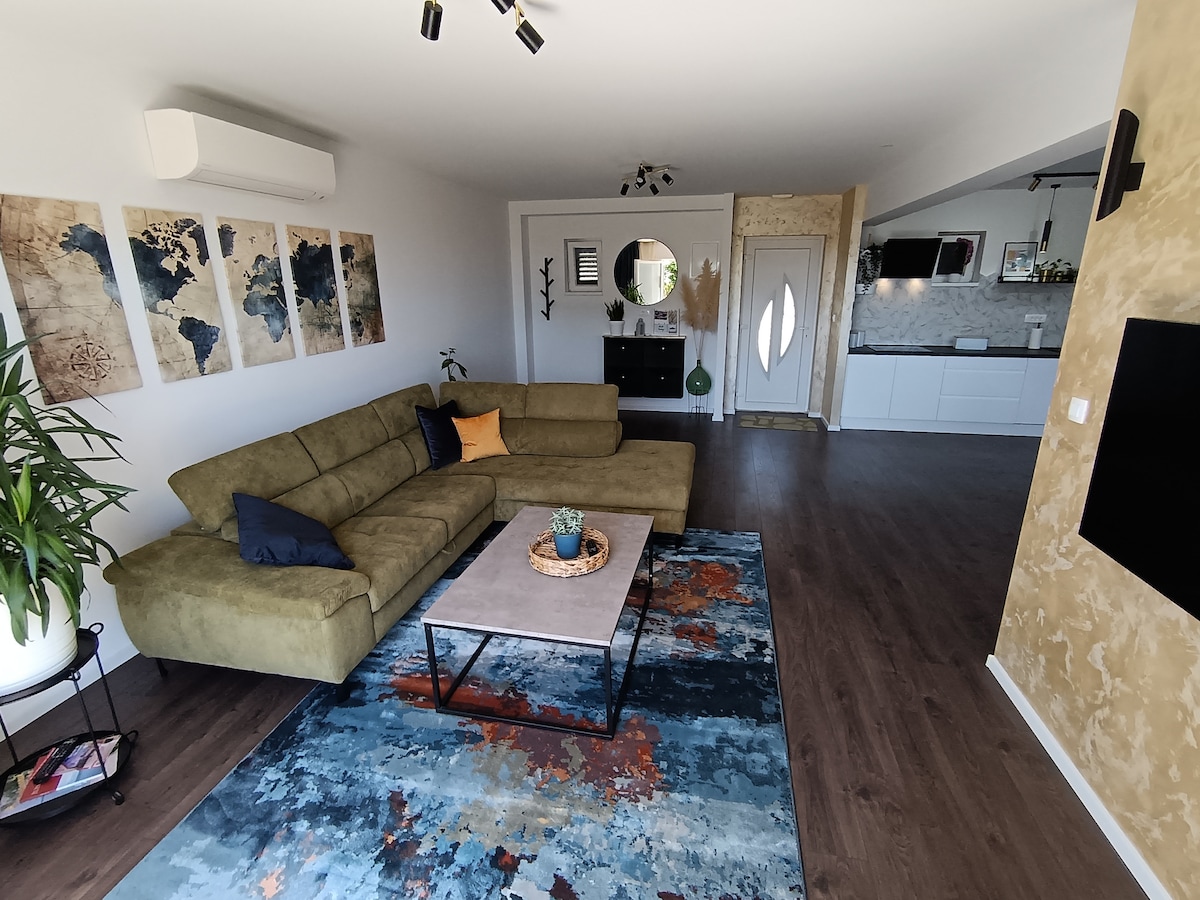 un apartamento de 120 metros cuadrados en un nuevo edificio moderno construido en 2022,para 5 personas, de los cuales 50 metros cuadrados es un jardín privado con jacuzzi privado con vistas increíbles de las islas del mar y puestas de sol. Garaje subterráneo gratuito. ¡La distancia al casco antiguo es de 2,5 km! En auto propio o taxi (6-7 € para 4-5 personas) a 5-6 minutos en auto. la parada de autobús está a 4 minutos a pie, 2.5 € por persona en autobús , viaje a 8 minutos. cerca del apartamento tienes supermercado, restaurantes,tiendas,bares puerto de barcos a 7 minutos a pie