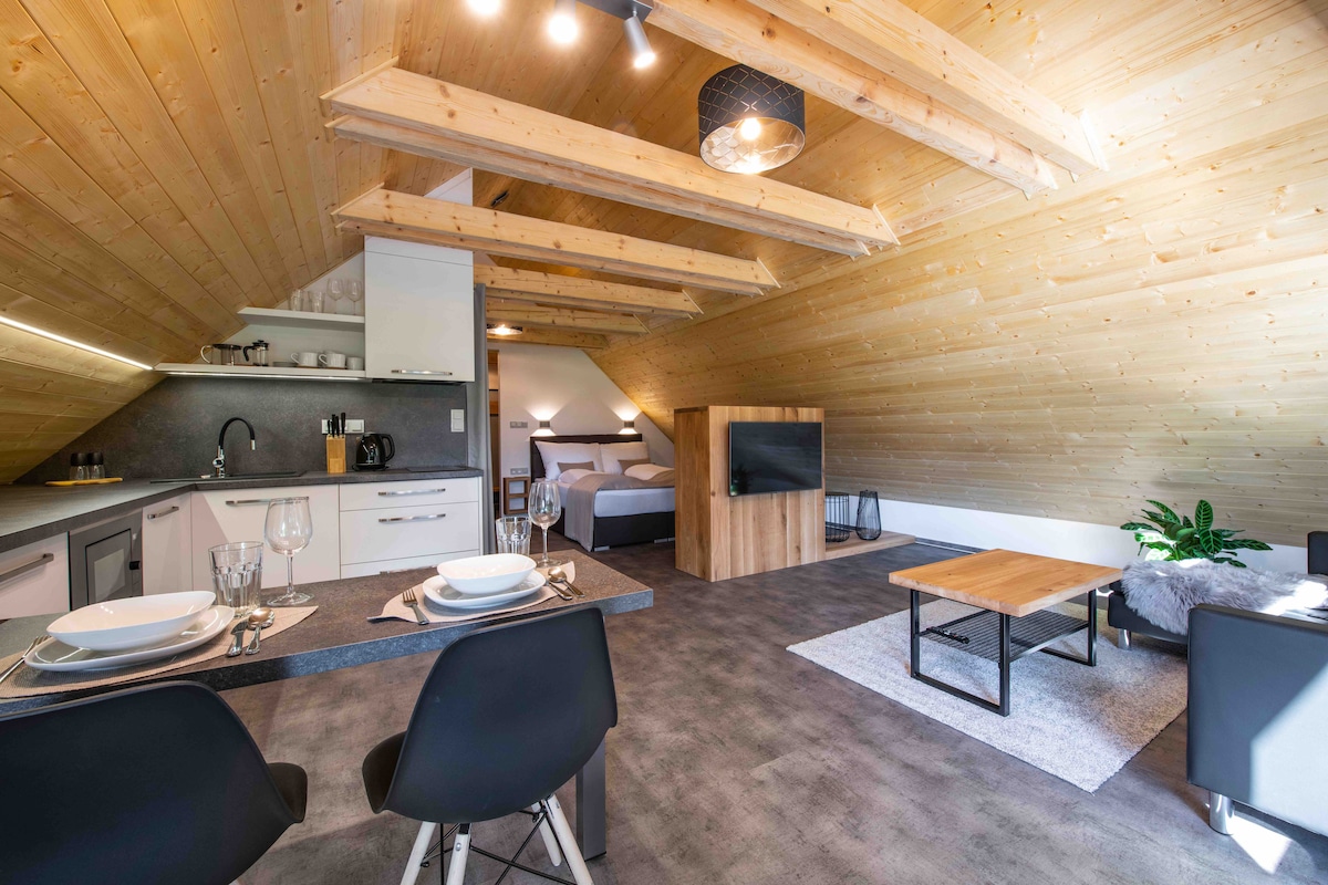 Podkrovní apartmán s infrasaunou | Rezidence Tři Studně Útulný a stylový podkrovní apartmán ideální pro 2 hosty, kteří hledají klid, soukromí a relax v přírodě Vysočiny. Součástí apartmánu je komfortní ložnice s manželskou postelí, obývací část, plně vybavená kuchyň s jídelním koutem, koupelna se sprchovým koutem a samostatné WC. Hlavním benefitem je soukromá infrasauna přímo v apartmánu, kde si dopřejete dokonalý odpočinek kdykoliv během pobytu.