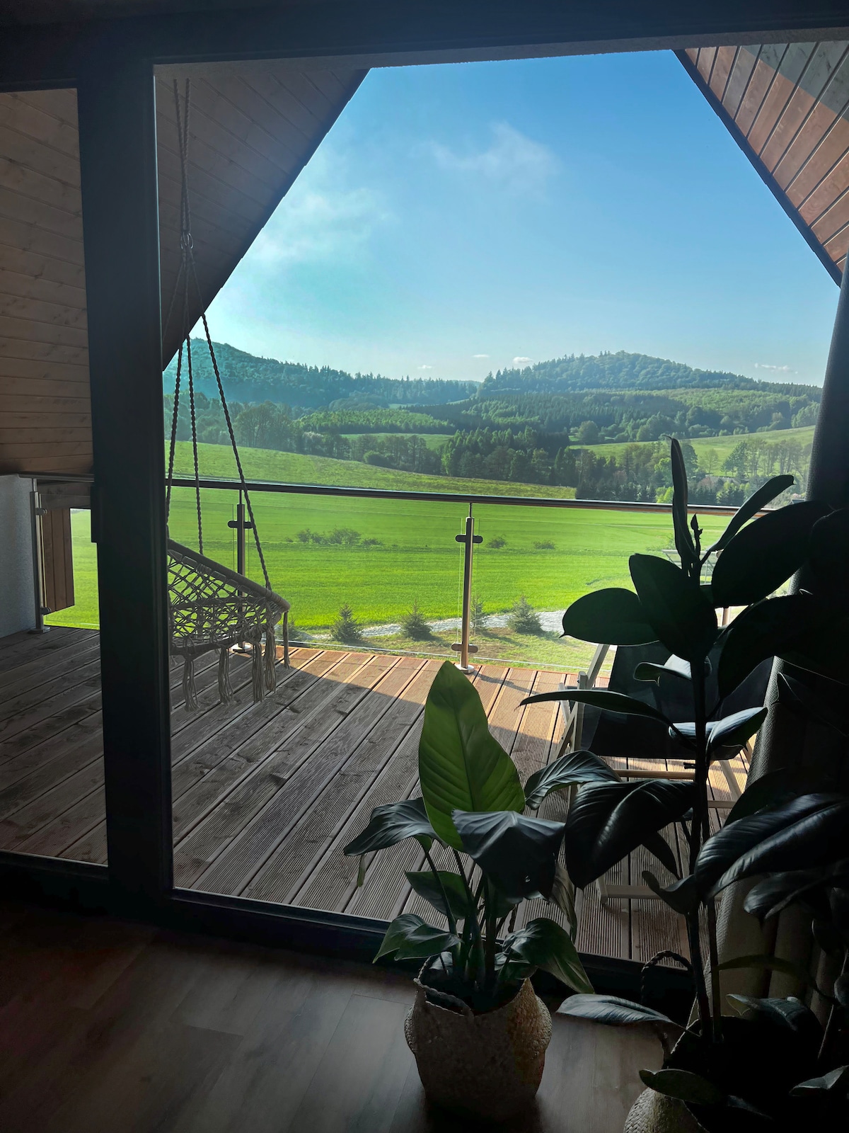 Te ofrecemos una casa de madera con una vista relajante de las montañas del búho, desde la cama puedes admirar hermosas y románticas puestas de sol con una copa de buen vino en la mano. Los rayos cálidos del sol naciente pueden despertarte por la mañana. Usa la terraza, si tienes un poco de suerte, verás ciervos pasando, que tienen su oasis en un bosque cercano. Relájate en este espacio tranquilo y elegante. Pero estaría garantizado :)