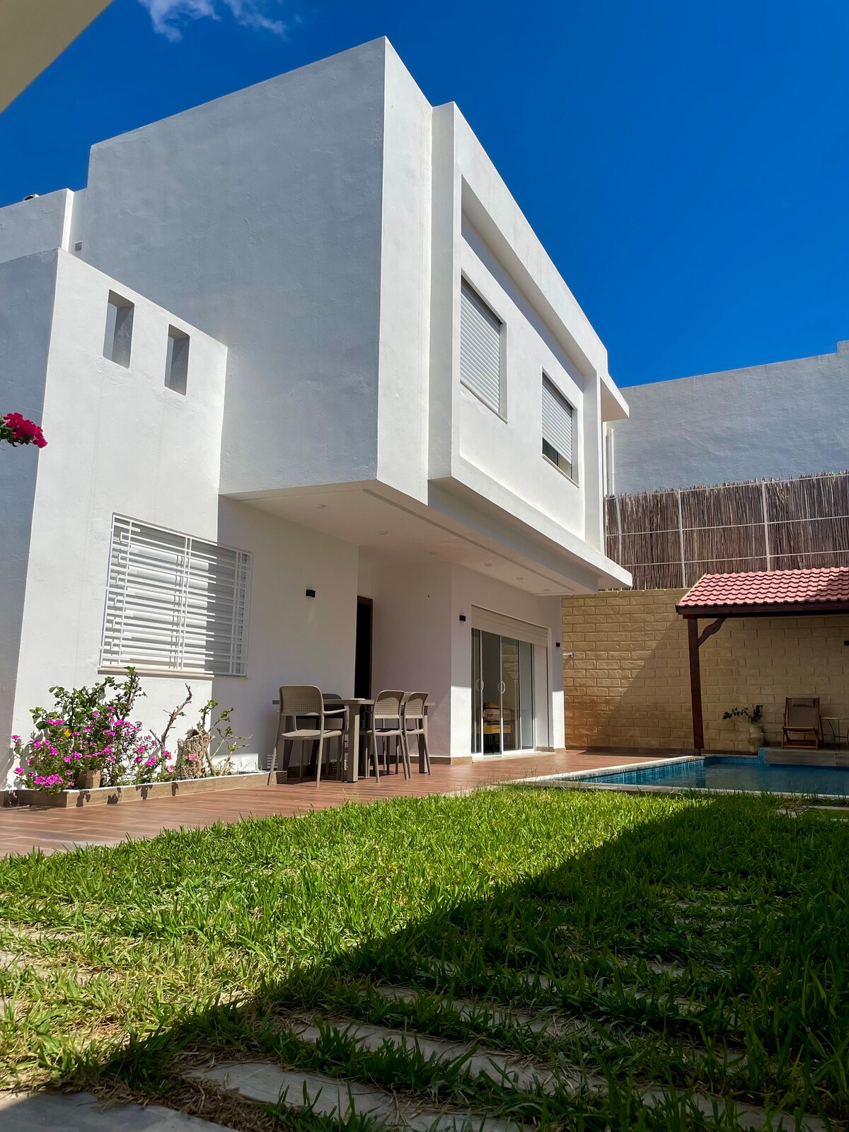 Villa in the calmest spot of Hammamet with a huge garden and big PRIVATE pool and patio. Equipped with a full list of amenities, stylish design and decor for a magnificent stay in the calm side of the mountain of Hammamet. Fire place in the living room and a fire pit in the garden for a warm moment with family and friends. Located in between Only 5 minutes drive to downtown and the beach and 5 minutes to the highway leading to Tunis and Nefidha Airport. A Padel tennis court is just few steps.