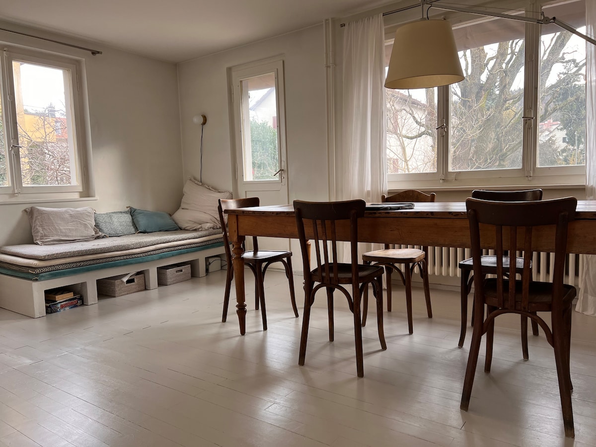 Este espacioso piso de oficinas convertido en un departamento se encuentra justo en el centro de Zúrich. A pocos pasos de la estación de tren principal, el lago/ río, encontrarás muchos restaurantes, bares, tiendas, supermercados y atracciones. Ofrece 1 dormitorio doble y una habitación de repuesto con colchón de piso individual y un sofá cama en la sala de estar. El baño/inodoro con ducha y un inodoro al lado de la puerta del apartamento solo para tu uso. Sala de estar con proyector, wifi y caja de música. Cocina equipada con zona de comedor.