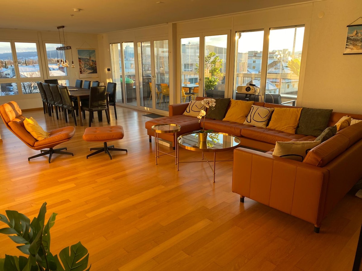 Moderne 4.5-Zimmer-Attikawohnung mit Alpenblick in Glattbrugg Erleben Sie höchsten Wohnkomfort in dieser lichtdurchfluteten 4.5-Zimmer-Dachwohnung (140 m²) mit zusätzlichem Wintergarten (22 m²) mit atemberaubender Sicht auf die Alpen. Die Lage ist ideal: Nur 2 Gehminuten von gleich zwei Bahnhöfen entfernt – in 10 Minuten erreichen Sie die Zürcher Innenstadt oder den Flughafen Kloten. Die Unterkunft wird von einer professionellen Reinigungsfirma gereinigt und vorbereitet.