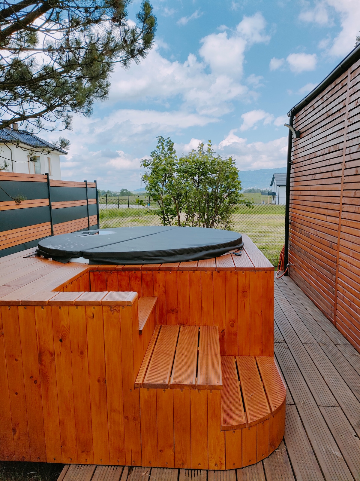 Colinas llenas de ciervos, que a menudo se pueden ver directamente desde el dormitorio o la terraza. Interior muy moderno, lleno de muebles hermosos y cuidadosamente seleccionados de madera exótica, equipado con equipos de alta calidad y camas muy cómodas. En el balcón, junto a los muebles y tumbonas de exclusiva madera de teca, hay una sauna finlandesa. La terraza exterior conduce directamente a la bañera de jardín con agua caliente. Acostado en la cama o en la bañera, puede admirar la vista de las montañas.
