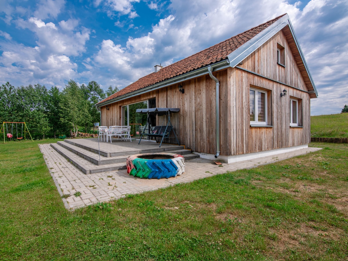 Cosy wooden house with private beach, jetty, rowing boat and fantastic view of the lake and surrounding trees. Finished to a high standard, 2 bathrooms, 4 bedrooms, living room with fireplace, fully equipped kitchen and large terrace, all designed having comfort and satisfaction of our guests in mind. On the fenced plot around the house, apart from a bonfire place with handmade benches and comfortable hammocks, you can find a lot of green space enabling all kinds of family recreation and relax.
